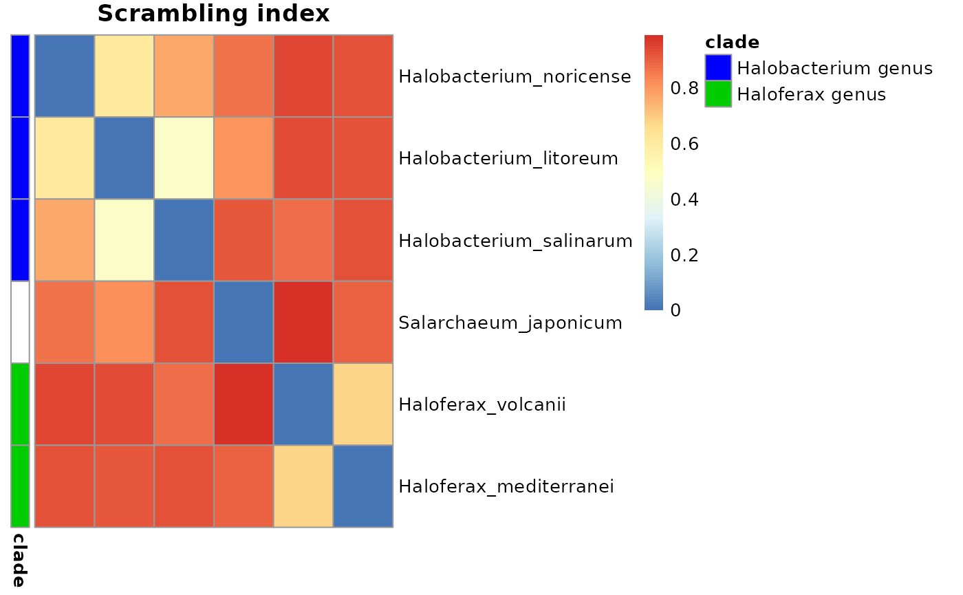 This package utilizes example YAML files containing summary statistics of halobacteria genome comparison data. In regards to genome scrambling, many studies have showcased significant genome rearrangements in such halobacteria species due to dozens of insertion sequence families.